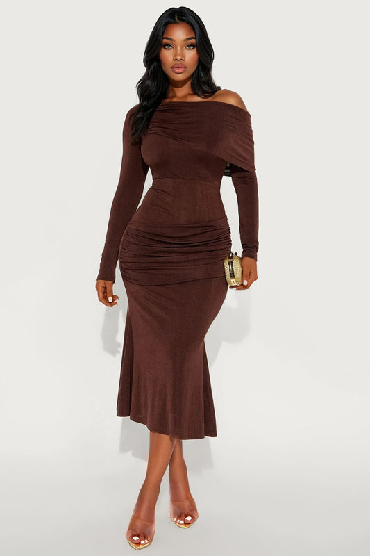 Available In Chocolate And Marsala. Midi Dress One Shoulder Long Sleeve Draped Detail Lined Stretch...