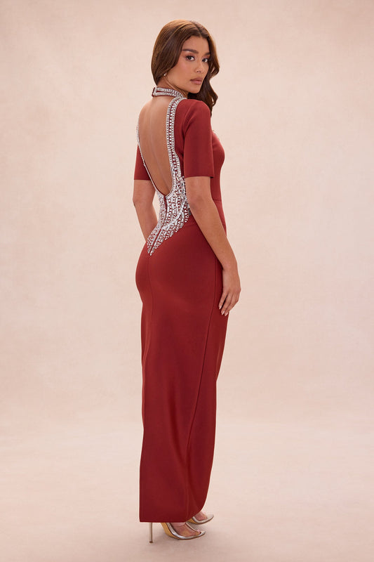 Available In Black And Copper. Bandage Maxi Dress Sleeveless Mock Neckline Rhinestone Embellishments Backless Back...